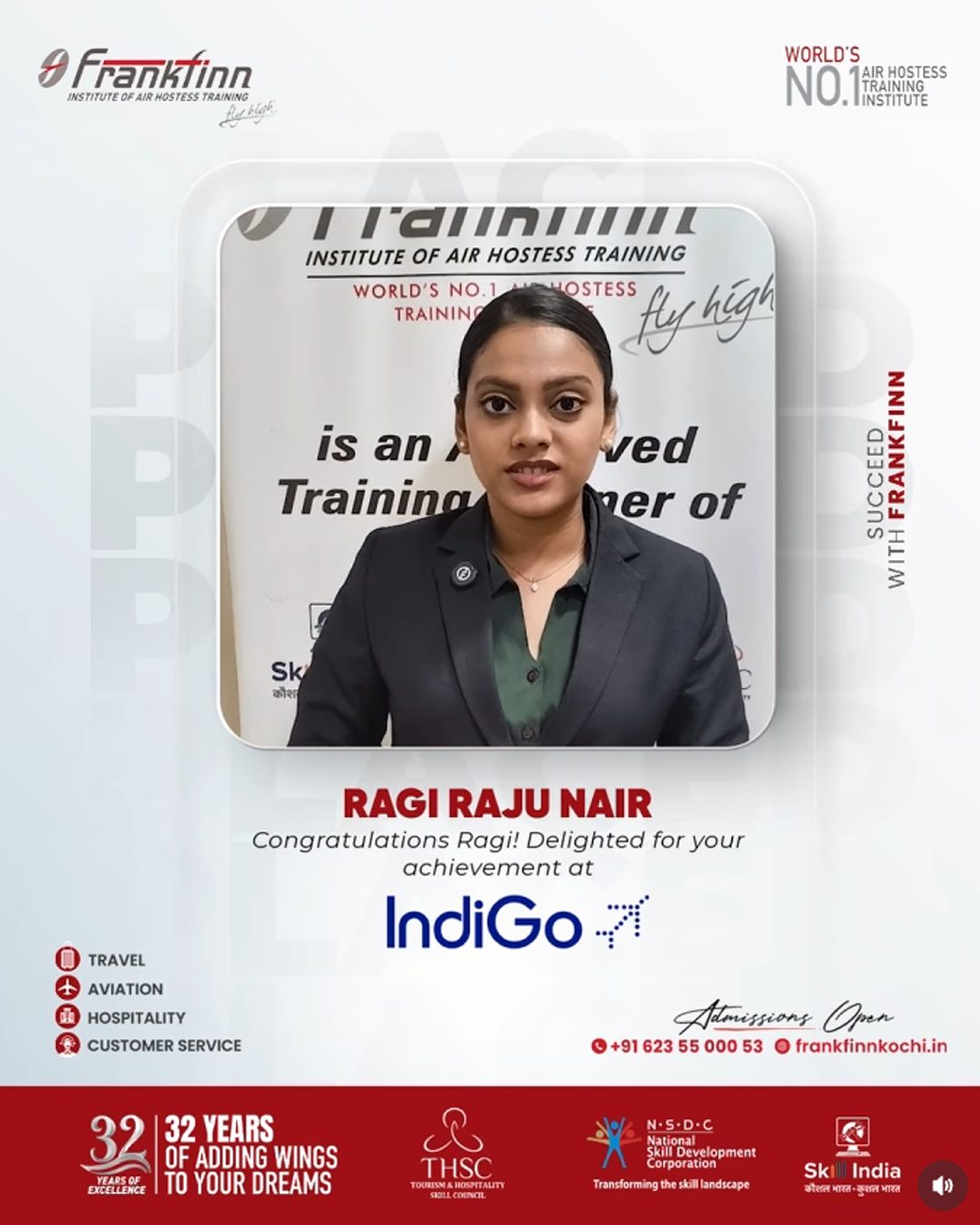 Frankfinn has been growing at a phenomenal pace since its inception in 1993 and is today recognised as the World’s No. 1 Air Hostess Training Institute. With a strong focus on creating versatile, balanced, and structured training programmes and certificate courses, Frankfinn equips students with the knowledge and skills needed to excel in Aviation, Hospitality, Travel, and Customer Service. Backed by years of dedicated research, highly qualified and experienced trainers, and a network of over 49 centres across India, Frankfinn delivers world-class training and placement support. Renowned as the best aviation institute in Kochi and also the best airhostess training institute in Kochi, Frankfinn continues to shape successful global careers in the aviation and hospitality industry.
