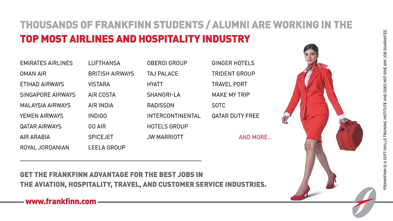 Frankfinn has long-term and trusted relationships with almost all of the major international and domestic airlines, leading 5-star hotel chains, and noteworthy enterprises in the Aviation, Hospitality, Travel, and Customer Service industries. Following that, these firms undertake private on-campus interviews for Frankfinn students at various training centres across the country